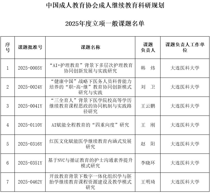 12月17日,中国成人教育协会公布2025年度成人继续教育科研规划课题立项结果,我校共有7项课题获批。